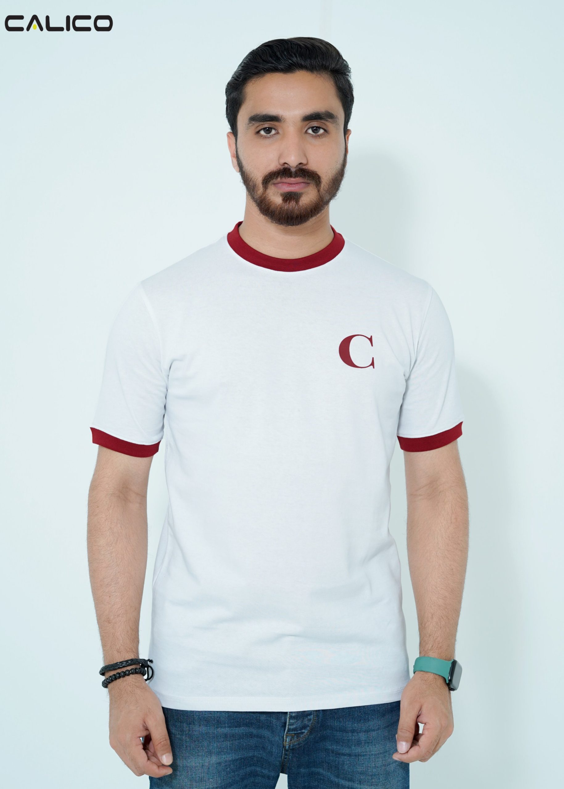 Style: White T-shirt with Maroon Contrast Neck and Sleeves