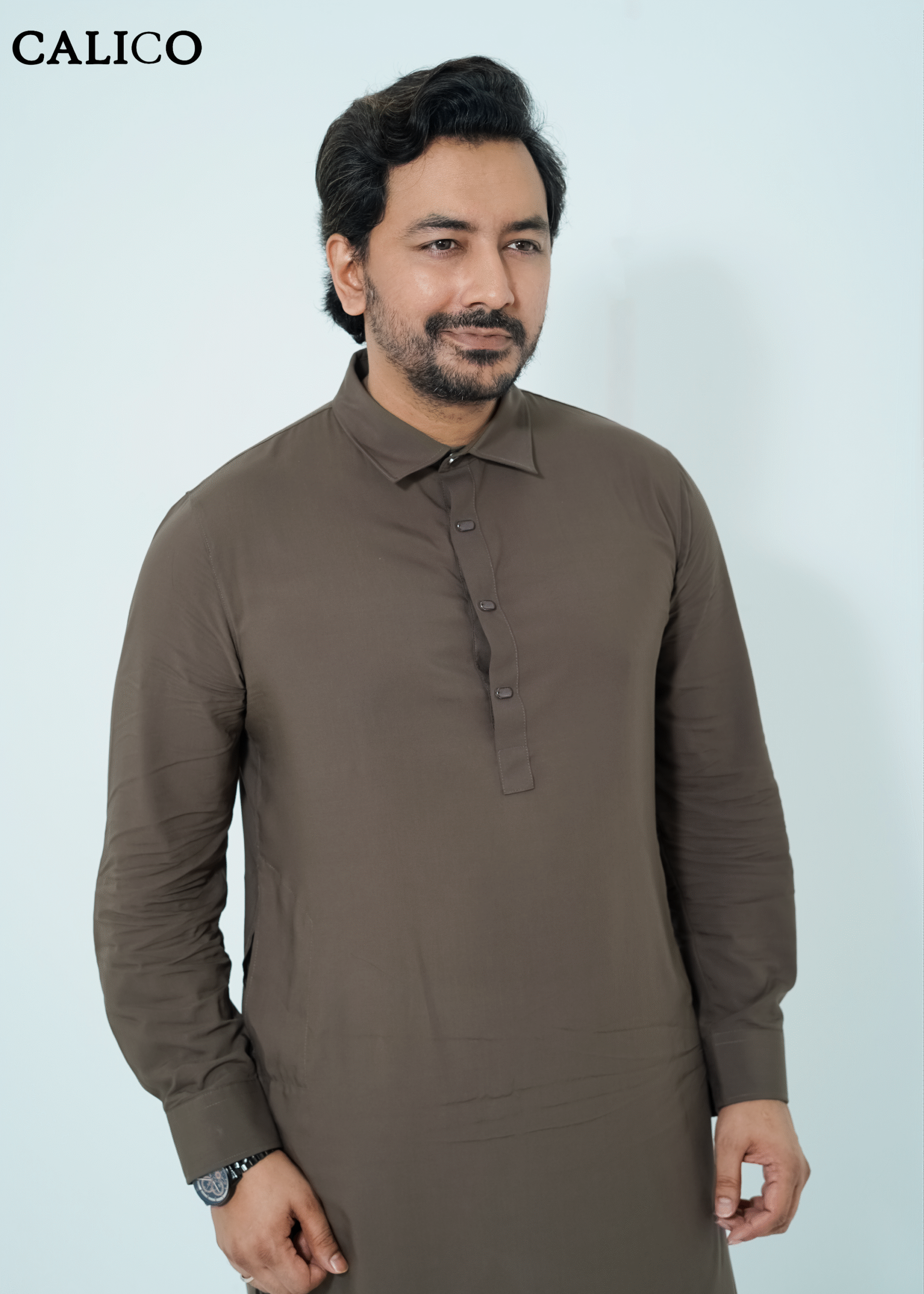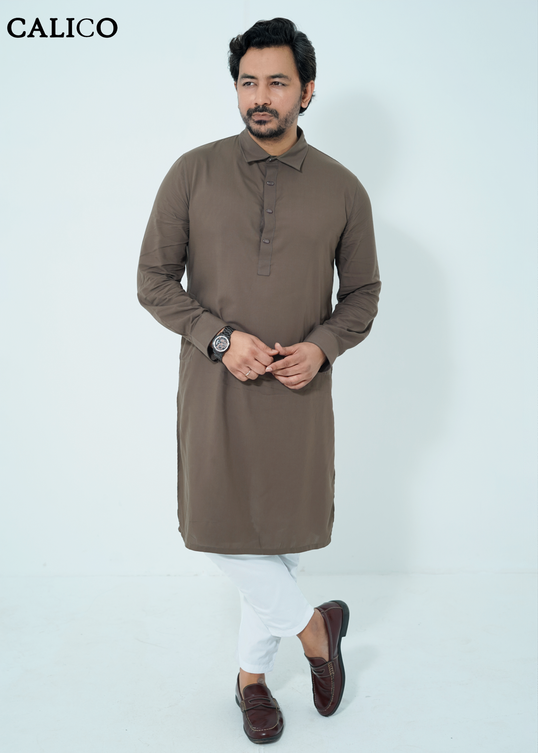 Elevate your traditional wardrobe with the Calico Panjabi C1, crafted from 100% viscose for a soft and breathable feel. This brown Panjabi features exquisite embroidery on the neck and placket, adding a touch of sophistication to its classic design. The snap button closure ensures both convenience and style, making it perfect for festive occasions or casual gatherings.